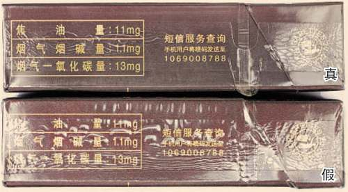 一、正面商标纸印刷工艺差异对比:真烟商标纸采用复合镭射银卡纸,胶印和丝网印刷,“和天下”字体采用压凸烫金工艺,用手摸凹凸感较明显,且字体笔画较粗,商标纸上字体、拼音、花纹看上去有较清晰的竖线;假烟一般为高清扫描仿制印刷,“和天下”字体用手摸凹凸感不明显,且字体笔画较细,商标纸上拼音、花纹等处竖线较模糊。