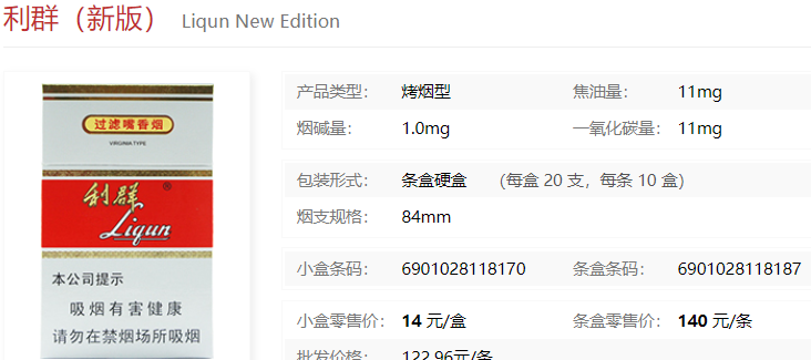 条盒零售价:140 元/条